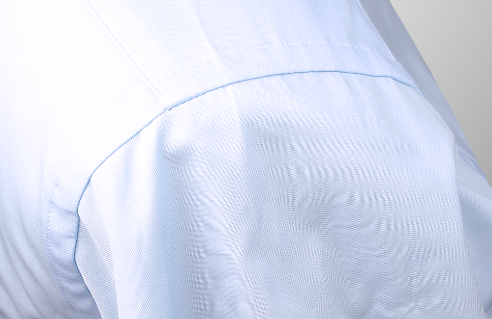 肩や腕の動きを高めるために2枚の生地を背中の中央で縫い合わせたスプリットヨークを採用しております。一枚で仕立てよりフィット感と耐久性に優れます。